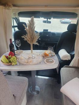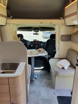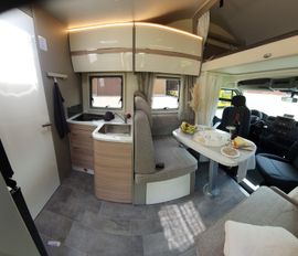 Die Sitze im Fahrerbereich lassen sich drehen, ebenso der Esstisch.